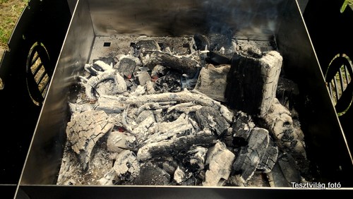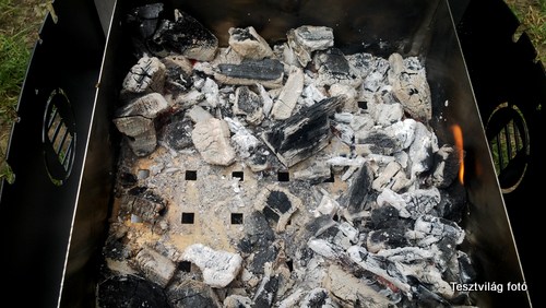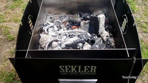 Míg a tésztánk kel, addig a mini sütőnkben parazsat kell szítani.Mi hagyományos faszenet használtunk, amit egyébként grillezéshez szoktunk. Sok probléma nincs vele. Amikor a parázs beizzik, akkor a faszenet oldalra kihúzzuk, és jöhet is sütés.