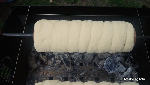 Az izzó parázs felett aranybarnára sütjük. Fogjátok látni, hogy a cukor megolvad a tésztán, amikor olyan, mint a Dobos tortán a cukor, akkor már oké. Dióval, kókusszal, kakaóval, fahéjjal ízesíthetjük azonnal a parázsról levéve. Na és ami még igen fontos, aki lusta vagy, nem akar egyszerre két kalácsot sütni, arra is gondolt a Vitéz Kürtős Team. Ugyanis az egyik sütőhenger végére fel lehet szerelni egy elemes kis motort, (Varta elem volt a segítségünkre) ami folyamatosan forgatja a kalácsunkat, elősegítve az egyenletes sütést.