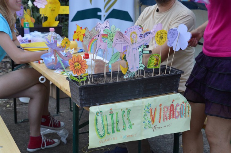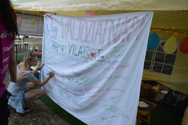 Innen a civil szférába vezetett az utam, ami nem volt politikamentes: egyből az LMP-be, majd a Jobbikba futottam. Utóbbinál nem időztem, csak az újságjukat hoztam el, mert közepén vannak vicces matricák, meg jó lesz azt olvasgatni egyszer. Az LMP-nél kereket forgattam, ahol egy mangalica telep lett a jussom. Nem igazán értettem, hogy ezt mit jelent. Majd kaptam egy kérdőívet, ami a mangalica telepre, EU- támogatásra tért ki. Nem értettem, hogy most ki kell választanom az abcd helyes választ, vagy valaki leül mellém és elkezdi nyomni a kormányellenes kampányát. Majd rájöttem, hogy vegetáriánus lévén, aki hiszi-vallja az ahimszát, kicsit sem érdekel a téma, sőt inkább feldühít. Így közöltem, hogy kockáztatván azt, hogy nem nyerem meg a brüsszeli utat, de passzolom a teszt kitöltését, mert nem értek vele egyet. Erre a lány közölte, hogy ők sem, én meg élből visszakérdeztem: de megeszed őket ugye?! És itt be is fejeződött a civilszféra látogatásom. Láttam még HIV szűrésre buzdító sátrat, és egy nagy falat, amit festhetett bárki. Volt időm még a Maffiáig, így leültem a Víztornyos helyre, ahol ismét késésben voltak. A kiírásból láttam, hogy Majka lesz és a Hősök a Dob és basszusban. Megzavart a dolog, annyira hogy el is felejtettem, hogy volt/van egy ilyen beszélgetős műsor, ami olyan élettörténetes, mesélős, dalszövegelemzős. Hát persze, hogy a Hőssel kezdtek, ami sajnos engem nem annyira érdekel, pedig szeretek emberek lelkében turkálni, addig sem kell az enyémben. Kitartóan vártam, de közeledett a kezdés, így átmentem a második nagyszínpadra.