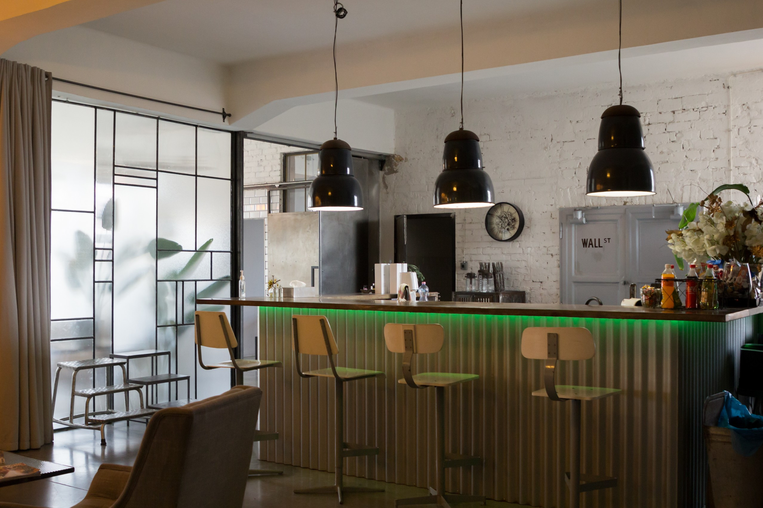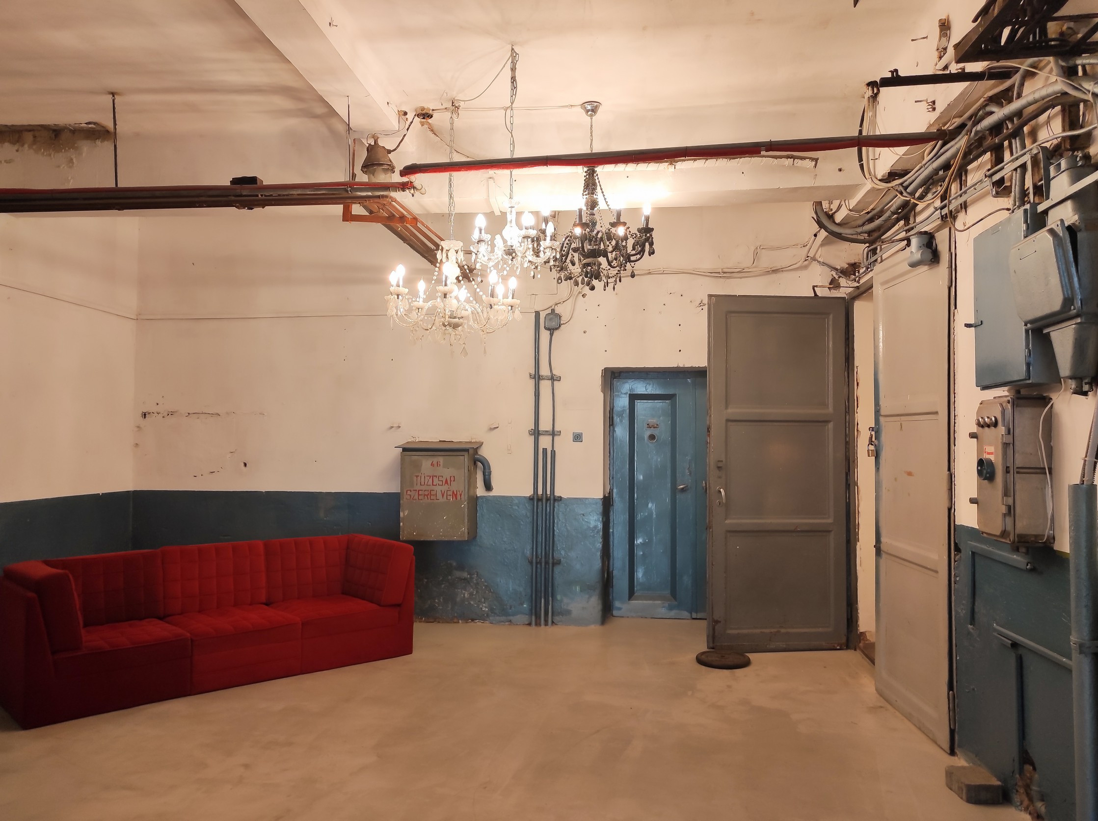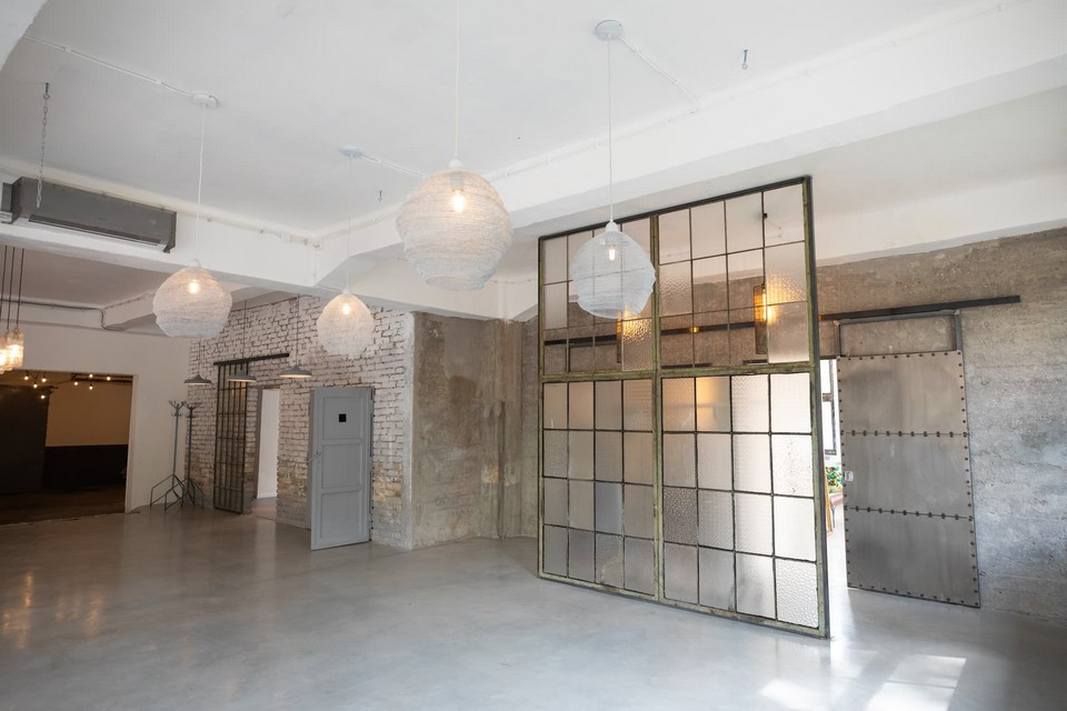 Az első szinten található a rendezvényterem, ahol akkor is egy workshop zajlott, amikor megérkeztünk. Ennek a neve Block9, amely a rengeteg nagy ablak miatt igencsak fényes helyiség. A falfelületekkel szintén játszottak, van itt látszó tégla, sima falfelület, vasajtó vagy éppen földig futó ablak. Van beton felület is, és egy gyönyörű régi ipari ablakból készített térelválasztó. A padló csiszolt beton, padlófűtéssel. A helység klimatizált, 4 nagyteljesítményű klímával rendelkezik. A térből nyílik a sminkszoba/öltöző/női mosdó együttese, férfi mosdó és a hinterland. Minden lámpája dimmelhető. Állandó berendezése a bárpult bárszékekkel és a mini konyha, designhűtő, kanapék, 4 asztal (2 fém és 2 fa), 2 könyöklő és 12 szék. Ez az egész 300 nm-en terül el és természetesen külön mosdókkal rendelkezik.
