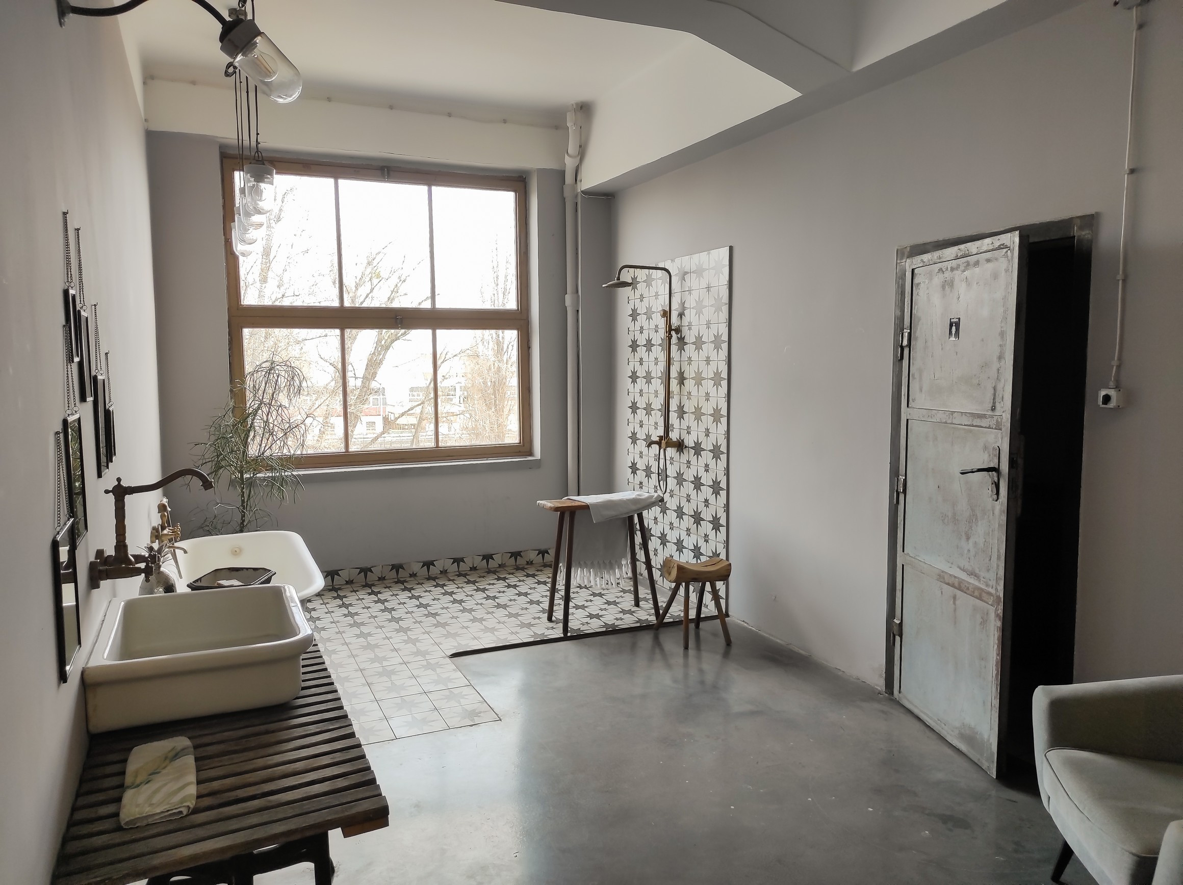 A Skandi egy több szempontból is nagyon érdekes terem. Évszaknak megfelelően úgyszintén fűtött vagy klimatizált, berendezése pedig nevéből adódóan Skandináv stílusú, letisztult. A plafonon látható több spot lámpa, melyek be és kikapcsolását egy távirányítóval lehet irányítani. Amik viszont rendkívül különlegessé teszik ezt a termet az az, hogy található itt egy konyhasziget, működő főzőlappal, így például szakács portrék vagy gasztro fotók is készíthetőek itt. A pult mögül tolóajtókkal nyílik még két rész, az egyik, egy rendkívül nagy öltöző, tükrökkel és további fénytechnikai eszközökkel. A másik terem viszont egy fürdőszoba, ahol található egy mosdókagyló, egy kád és egy zuhany is. Erről a weboldalon nem a Skandin belül hanem a Fürdőszoba menüpont alatt lehet bővebben olvasni. A kád és a zuhany is működik, használható fotózásokra, azonban előre kell szólni miatta, hogy biztosan legyen meleg vizünk. Persze nyáron lehet, hogy még jól is esne egy kis hűsítés. Innen nyílik még egy wc, ami a Skandi külön bejáratú mosdója. Ez talán egy picivel nagyobb, mint a recepciónál található, számomra már első pillantásra kicsit jobbnak tűnt, mint az előző, de természetesen ahogy az is, ez is tiszta és kulturált.