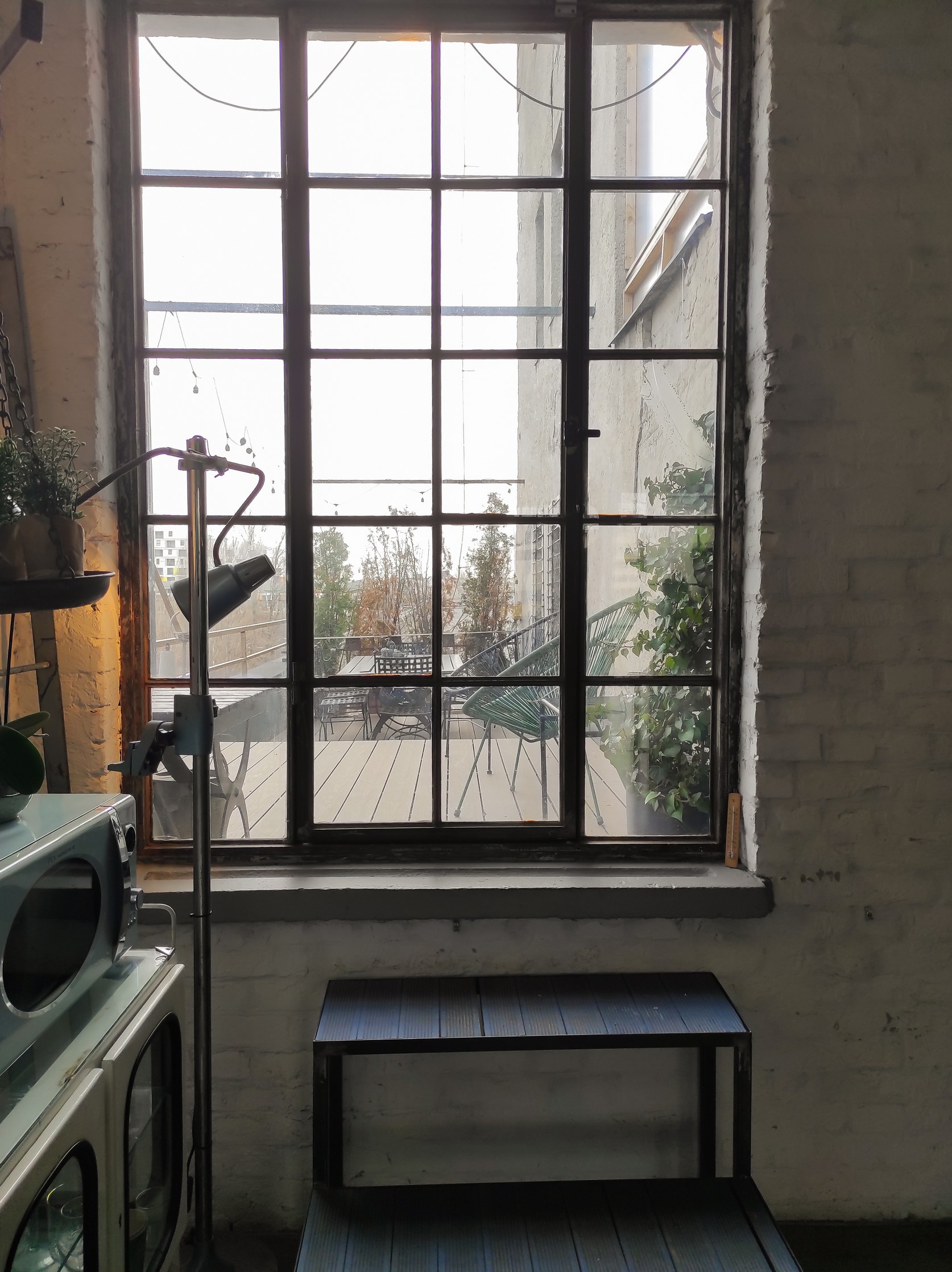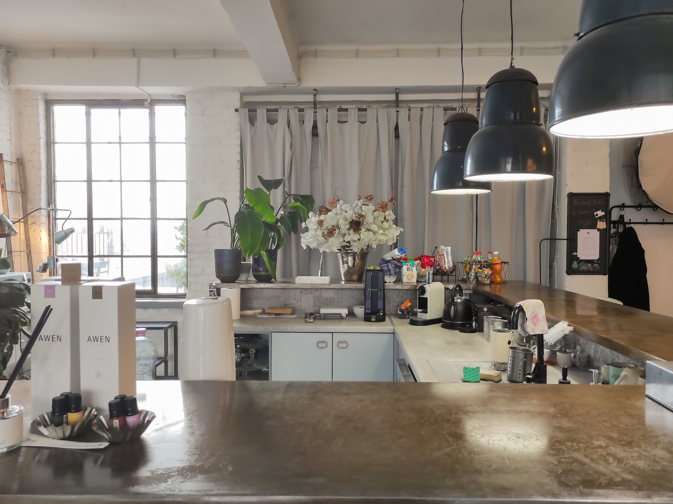 Itt egyébként egy kellemes illat keringett, amitől még otthonosabban éreztük magunkat. A pultban kérhető üdítő és kávé is, becsületkasszás alapon, de az italok ára egy kis táblán fel van tüntetve. Itt található a stúdió egyik mosdója is, ami bár első ránézésre nem túl bizalomgerjesztő, mégis stílusos és tiszta. Ami még egy rendkívül jó dolog az az, hogy kialakítottak egy teraszt a tetőn, ahová jó idő esetén ki lehet ülni, vagy itt is tudunk néhány képet lőni. A büfé árairól egy kis tábla tájékoztatja a vendégeket, tehát a fogyasztást a bérleti díj nem foglalja magában.