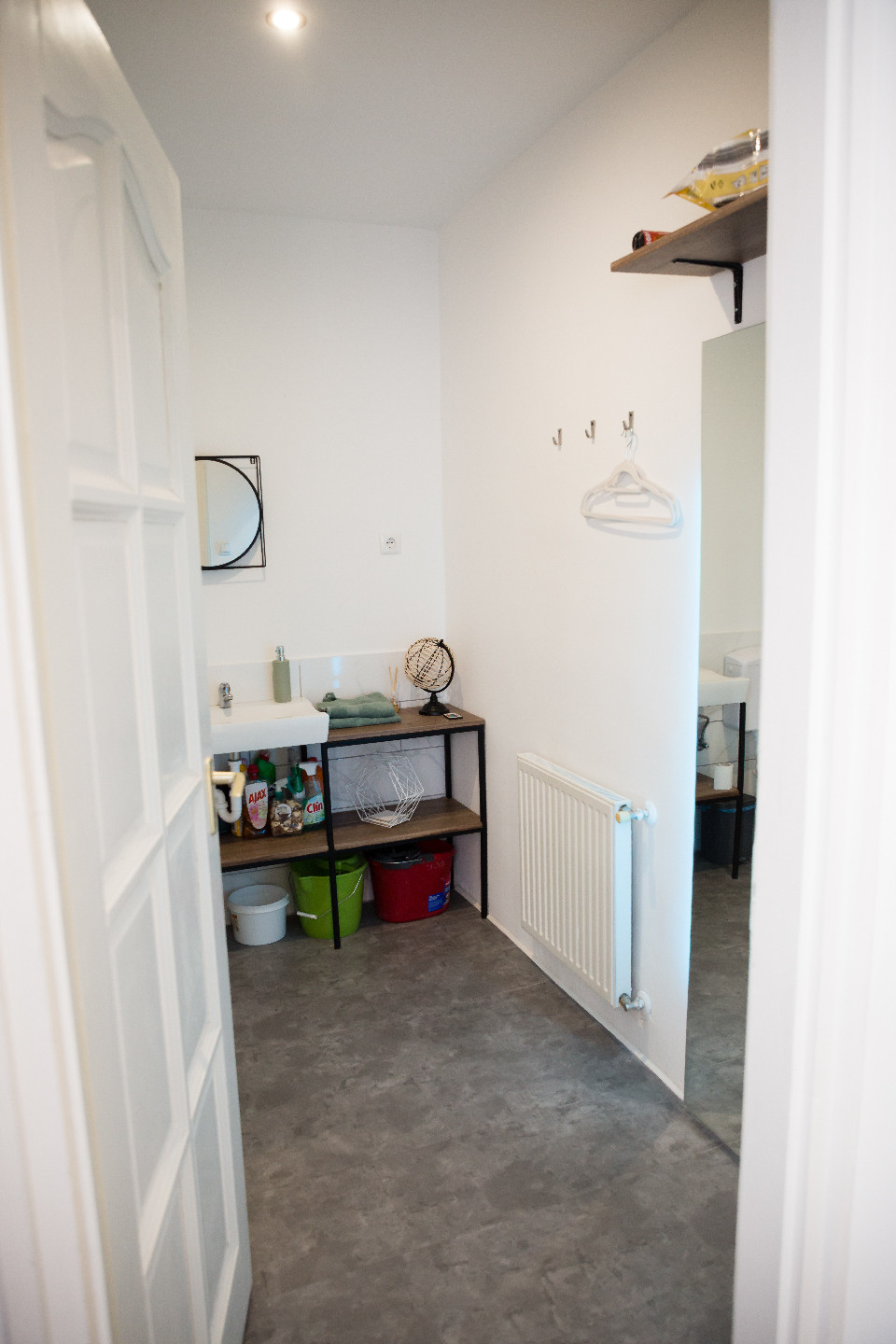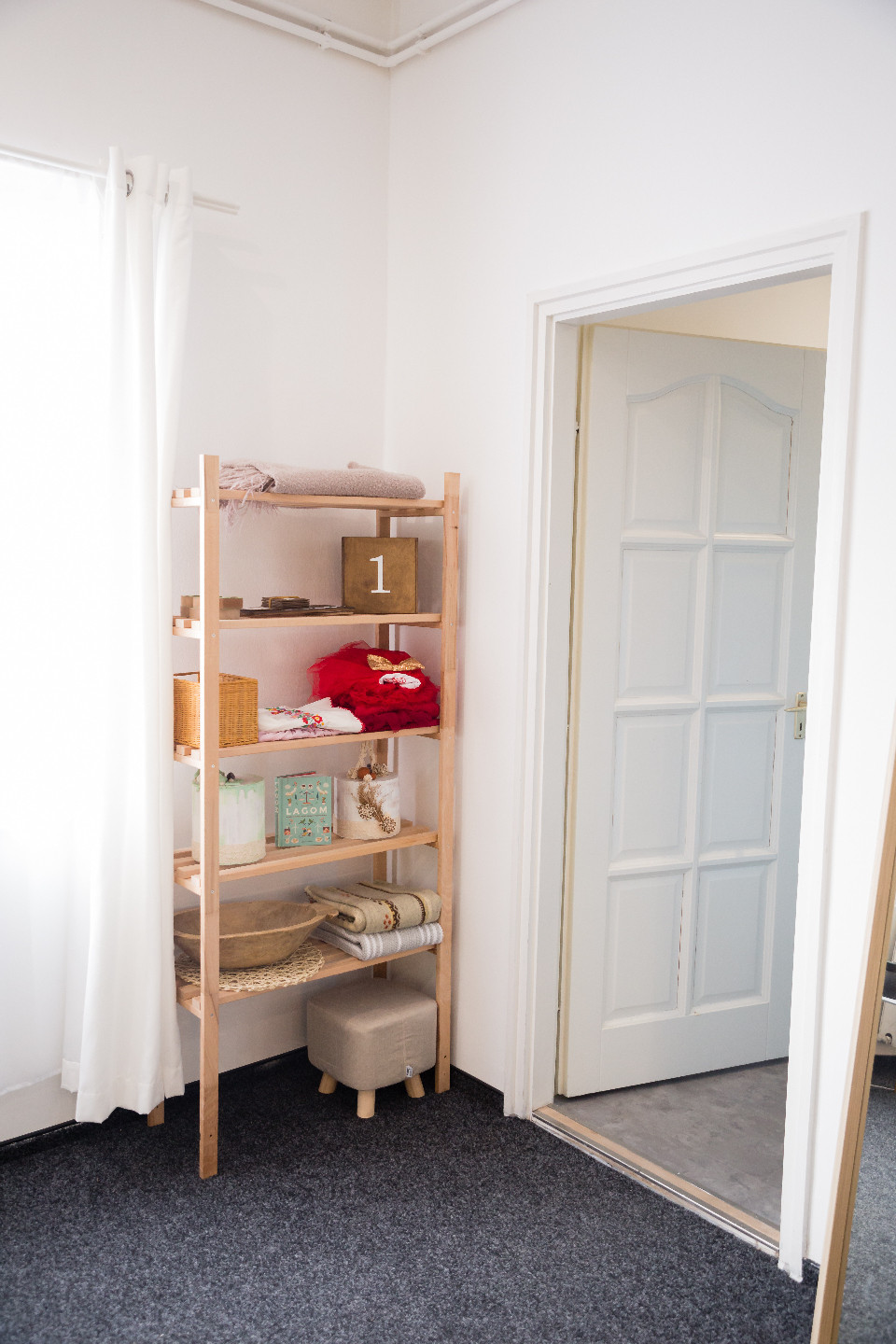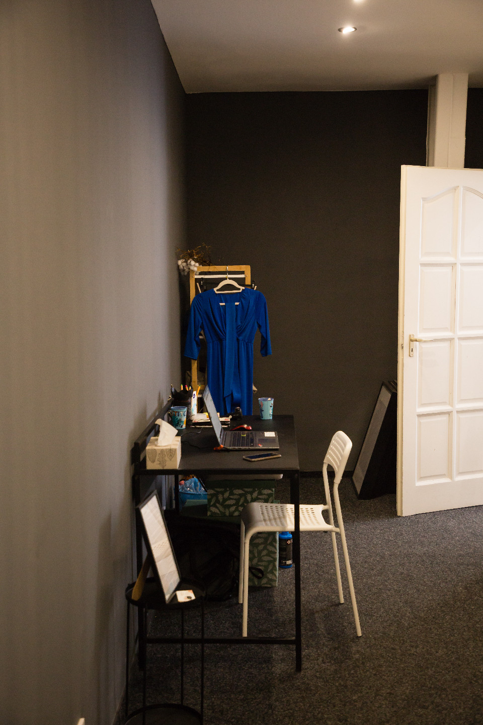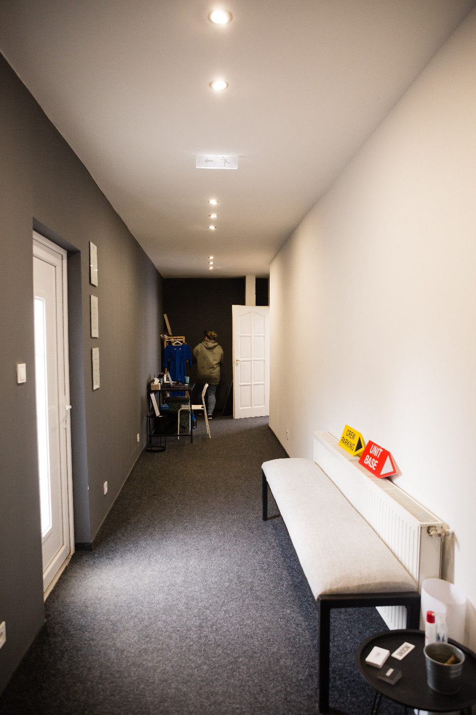 Itt az ablakban már láthatjuk a Lagom Stúdió tábláját. A fehér műanyag ajtón belépve egy sötétebb hangulatú folyosón találjuk magunkat, ahol, ha balra fordulunk láthatjuk Dóri munkaállomását. Erre kell tehát mennünk, és a folyosó végén jobb oldalon található a már melegebb, bohém hangulatú Lagom Stúdió.