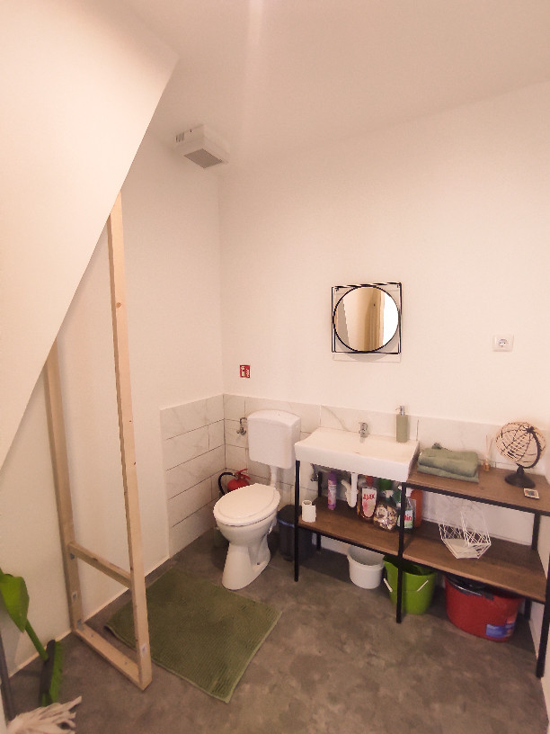 A stúdió maga 50 nm, amelynek saját mosdója van, így ki sem kell jönni a teremből, hiszen ezen belül van az elszeparált helyiség.