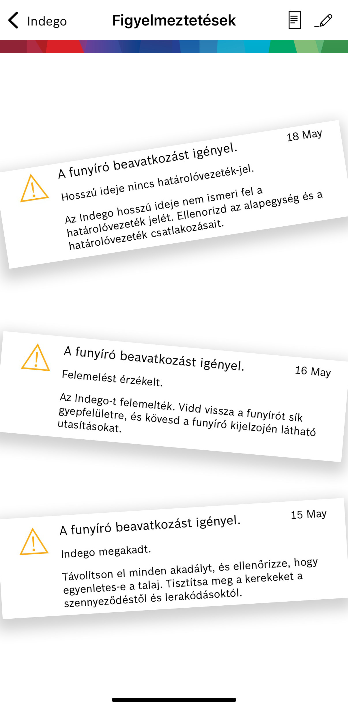 Robotfűnyíró menüje, benne az elmúlt napok hibaüzenetei és a leggyakrabban küldött hibák: