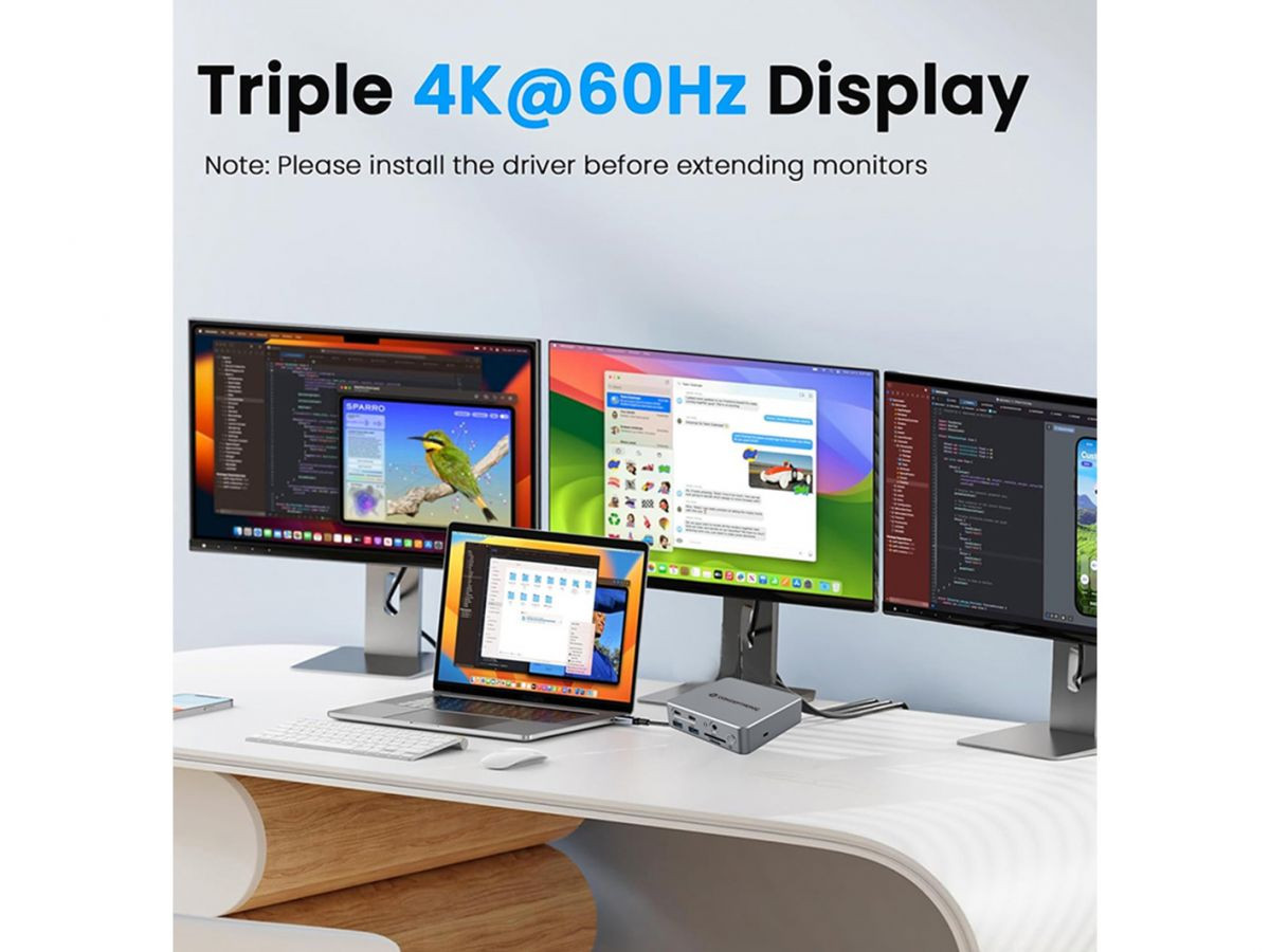- 3 db kijelző támogatása: 2x HDMI + 1x DisplayPort – akár 3x 4K@60Hz felbontással (DisplayLink technológiával)