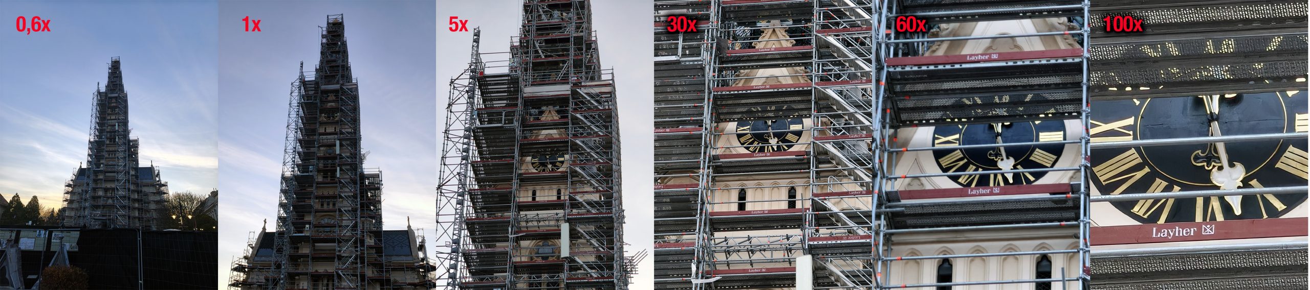 A templomtorony zoom teszt során a 3× optikai zoom hibátlan részleteket adott, a 10× hibrid még mindig használható.