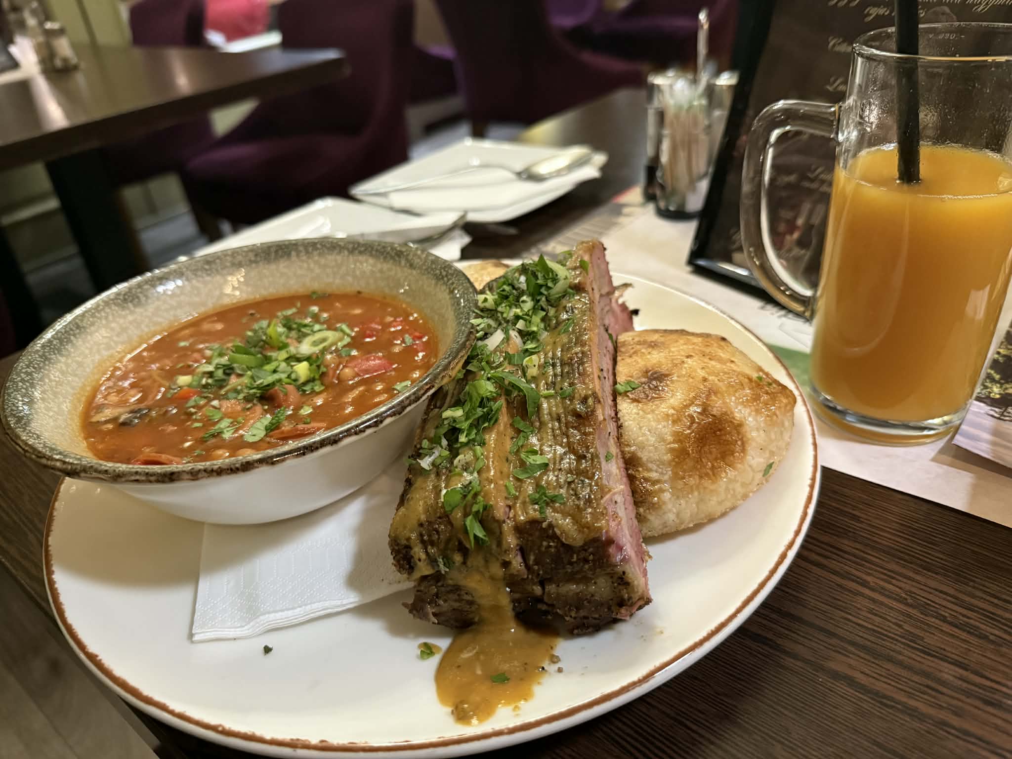 “Dzsozi” a pitmaster (A pitmaster a barbecue mestere: ő irányítja a füstölést, a hőt, a húsok elkészítését, és gondoskodik a tökéletes BBQ-élményről.) ajánlására a hétvégi ajánlatot választottam, a North Carolina Finest nevű, észak-karolinai sertésoldalast, chorizós sült babbal és lepénykenyérrel.
