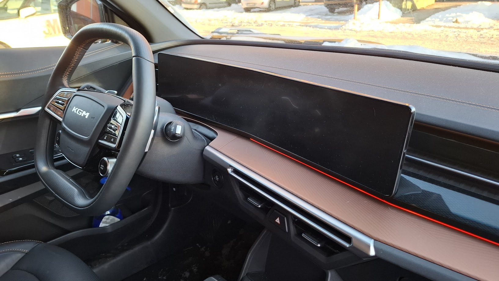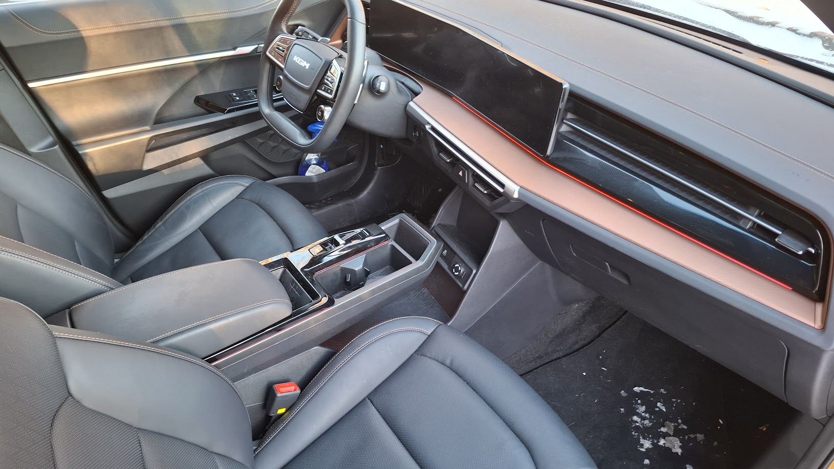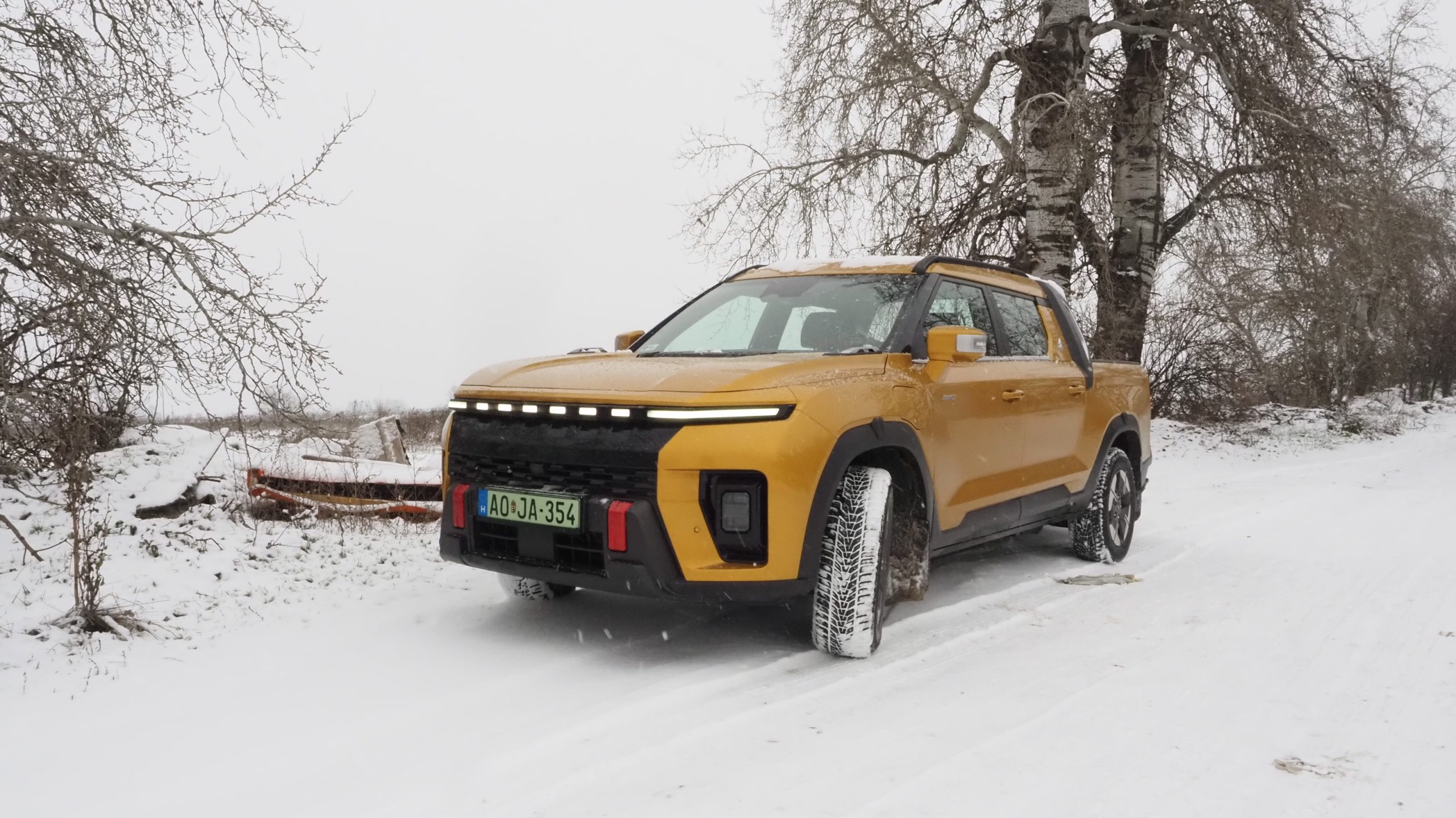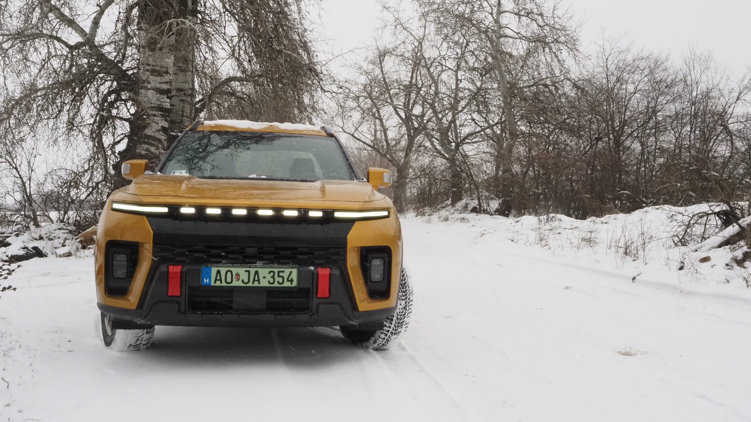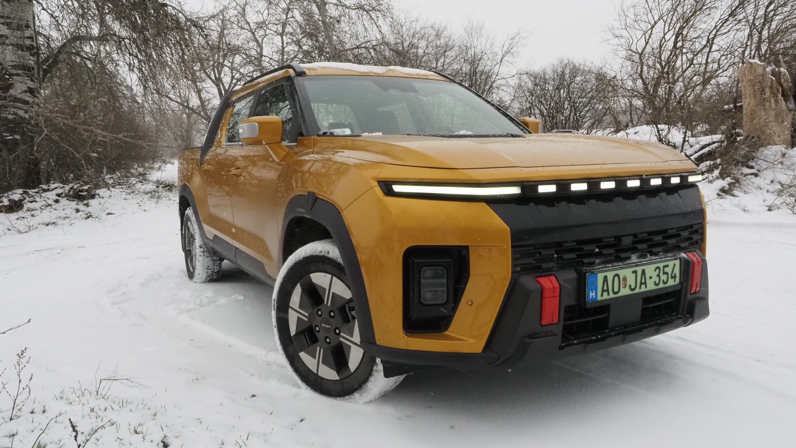 Amikor először megláttam az arany színű KGt Musso EV-t, bevallom, már akkor volt egy olyan érzésem, hogy ez nem egy átlagos elektromos autó lesz. Élőben a színe sokkal elegánsabb, mint képeken: nem hivalkodó, inkább határozott és prémium érzetet kelt. A tesztidőszak viszont nem volt kegyes – nagy hó esett, hideg volt, csúszós utak, pont azok a körülmények, ahol egy autó igazi arcát mutatja meg. Persze sajnáltam az autót, hogy havas latyakos bakanccsal kell beszállni, de ez most télen nem megy másként.