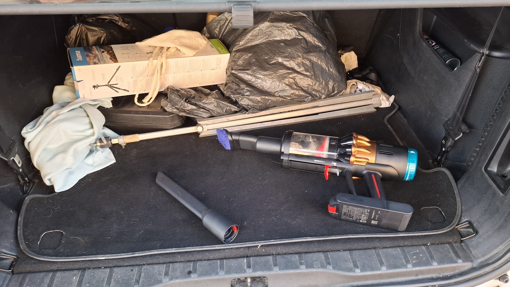 De nem csak a gyerekek miatt koszolódik egy autó. Amit használunk, az koszolódik – ez ennyire egyszerű. Nálam például a csomagtér az, ami igazán igényli a rendszeres porszívózást. Folyamatosan szállítok benne mindent pl.: virágföldet, bevásárlás, különféle teszttermékeket- dobozokat és csomagokat. Ezek után a csomagtér nem marad tiszta. A Dyson viszont itt is hozza, amit kell: könnyű, erős, gyorsan előkapom, és nem halogatom a takarítást.