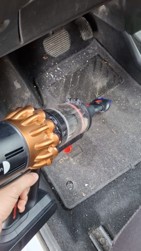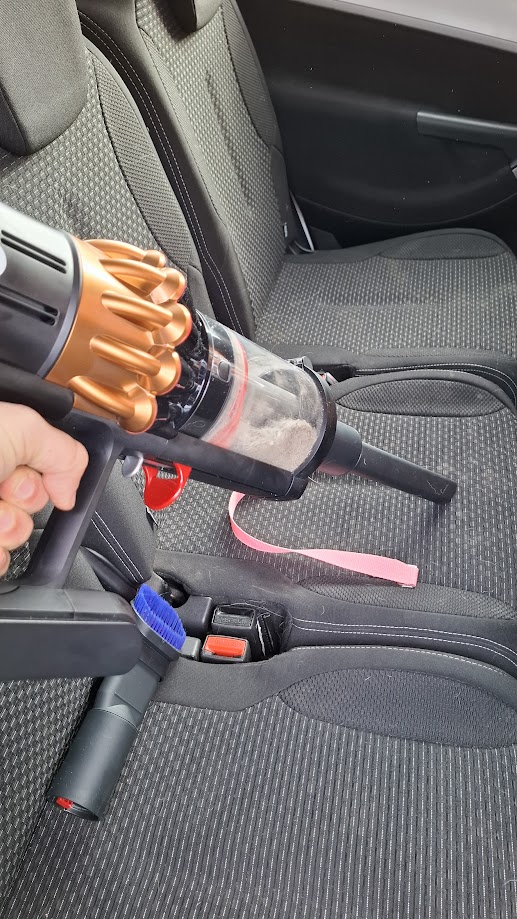 Ami autóban még hatalmas előny, hogy rengeteg olyan kis rés van, ahová egy normál porszívóval esélytelen beférni. Az ülések között, az ülés síneinél, a háttámla és az ülőlap találkozásánál mindig összegyűlik a kosz. A Dyson vékony szívófeje ezekre a helyekre konkrétan tökéletes, könnyedén befér az ülések közé, lemegy az ülés alá és kiszedi a koszt a sínek mellől is, ezért nem kell forgatni, erőlködni, „trükközni”