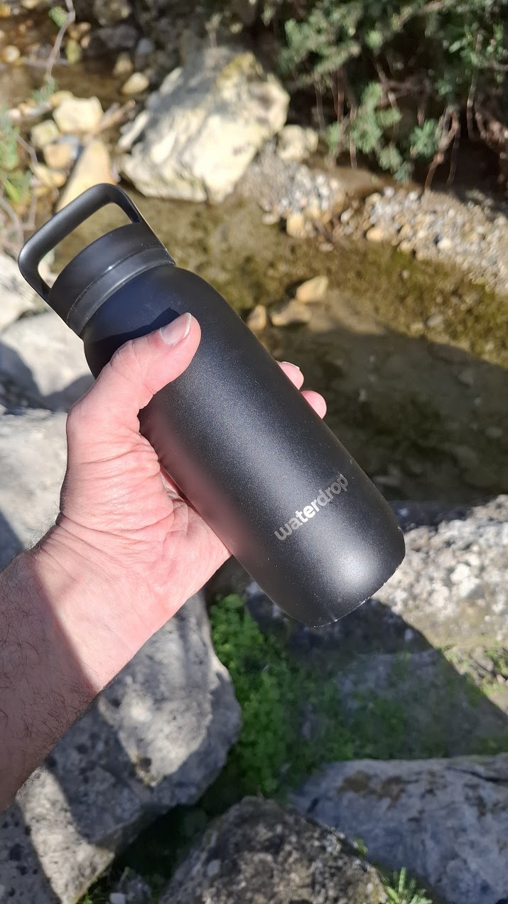 A hátizsákomhoz a waterdrop kulacsomat egyszerűen a kupaknál fogva rögzítettem, így mindig kéznél volt. Ez túra közben meglepően sokat számított, mert nem kellett állandóan elővenni a táskából. Ráadásul a duplafalú kialakítás tényleg működik: még órákkal később is kellemesen hideg maradt az ital, pedig kint bőven 30 fok fölött volt a hőmérséklet.