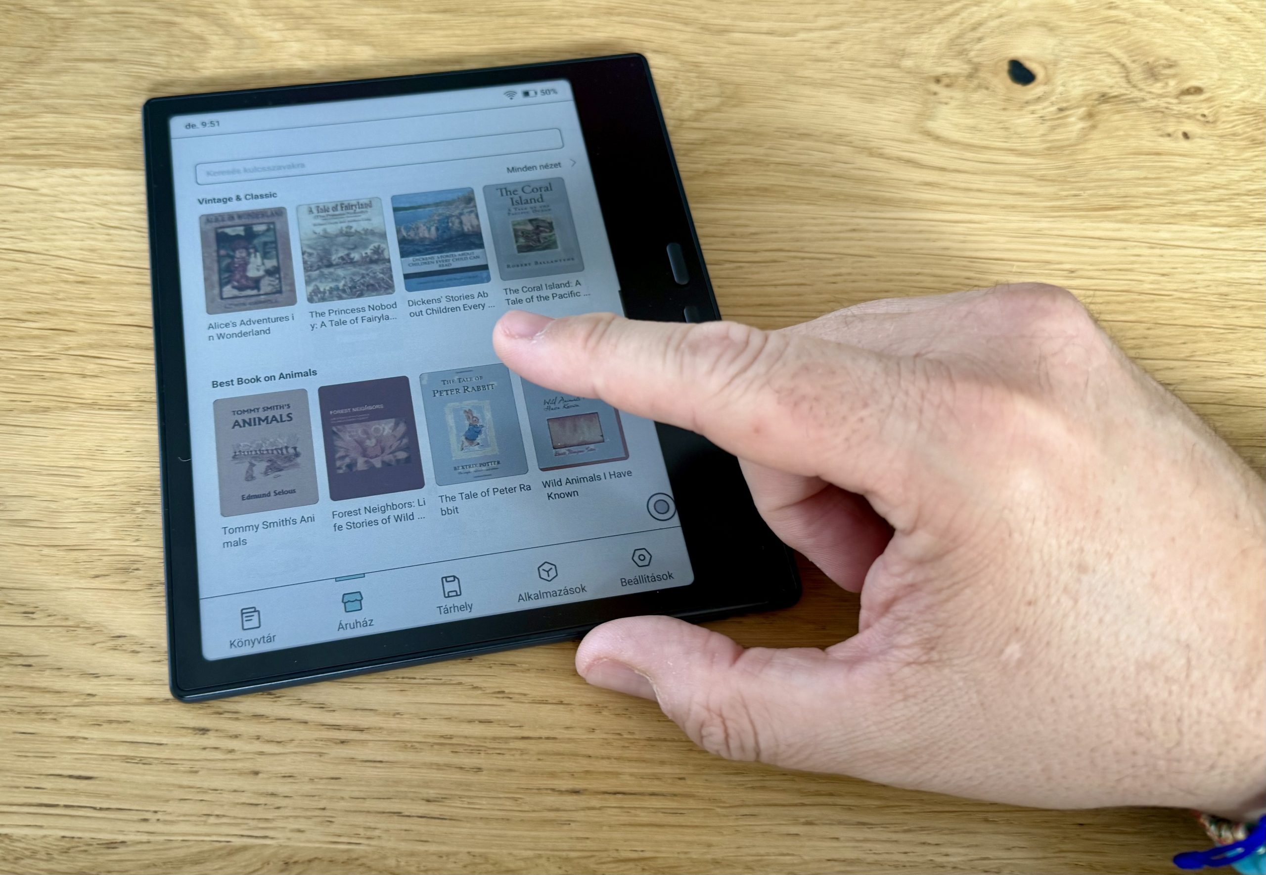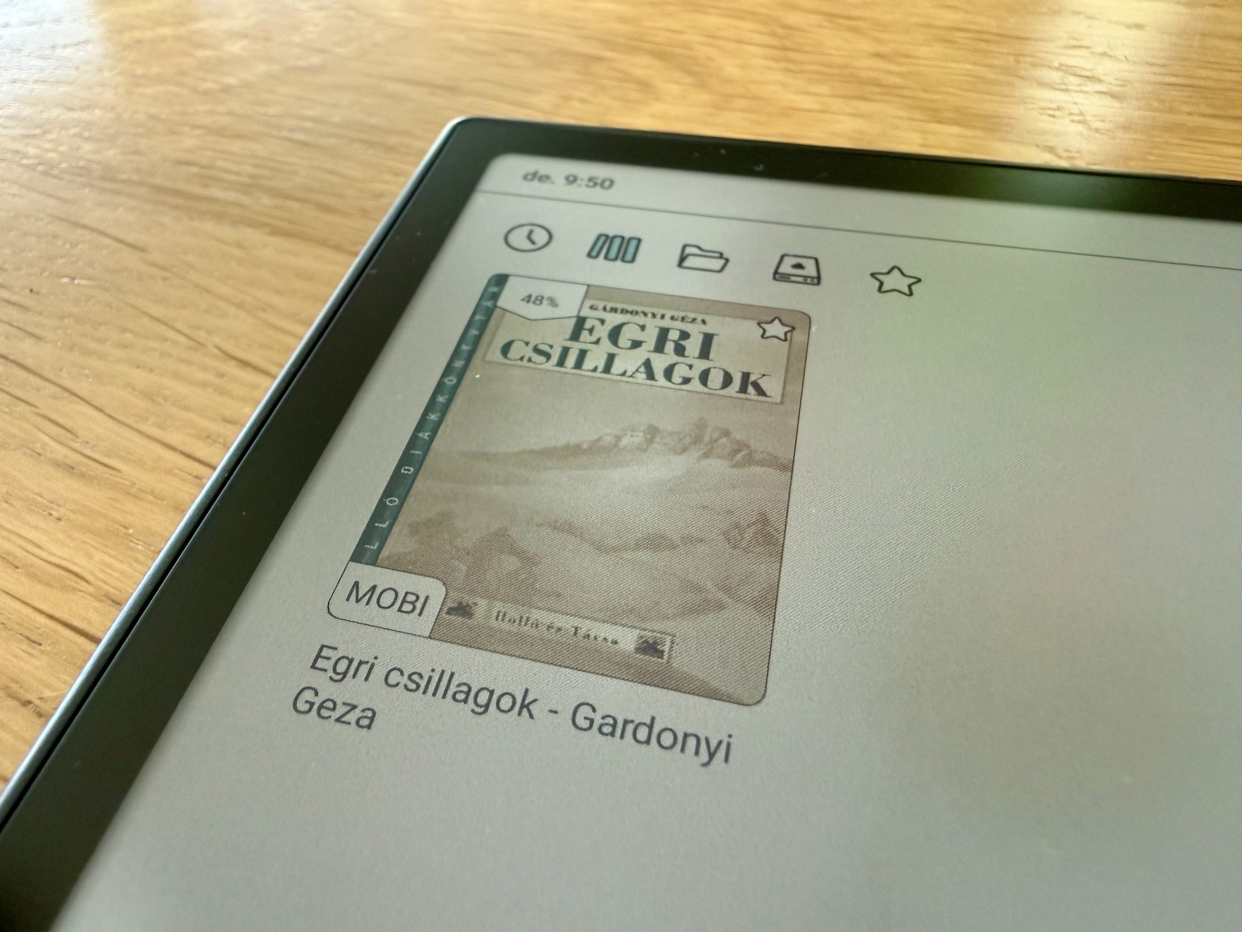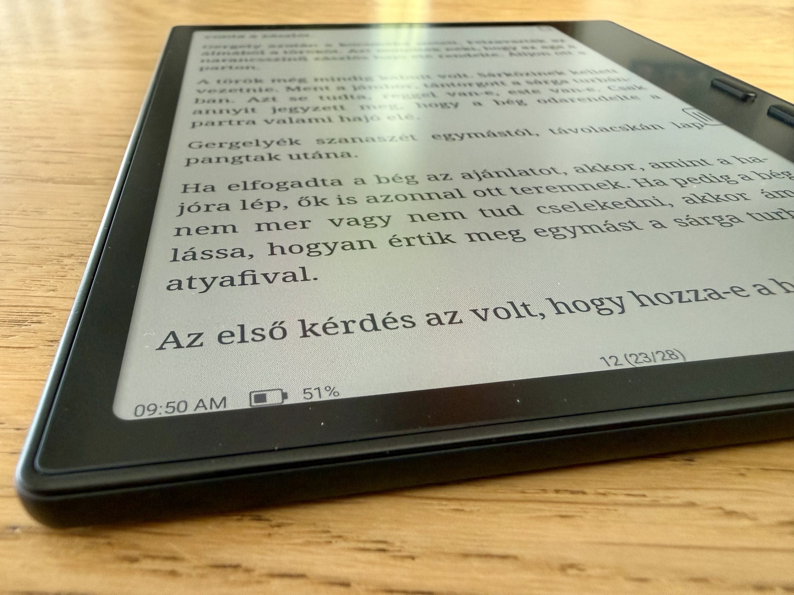 Ami külön érdekes: egyetlen töltéssel végigment az egész könyvön. Közben mi is használtuk az eszközt – én neteztem rajta, anyuka olvasott rajta más könyvet. Ez az üzemidő nem papíron jó, hanem a valóságban is.