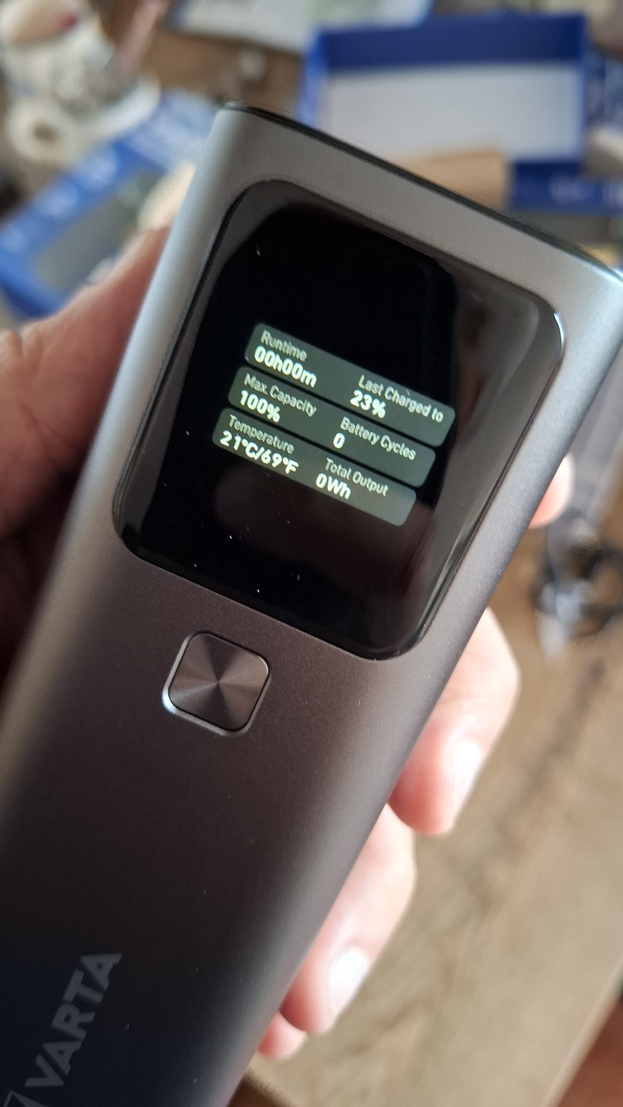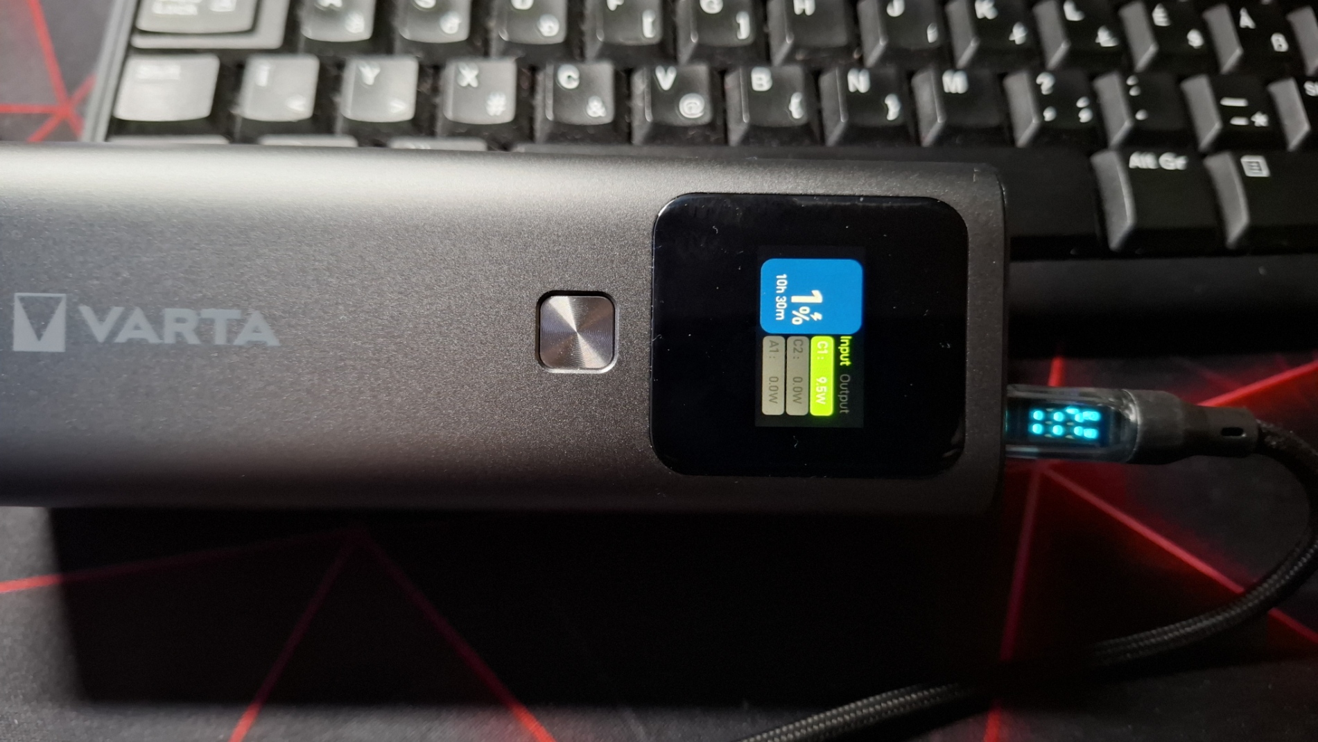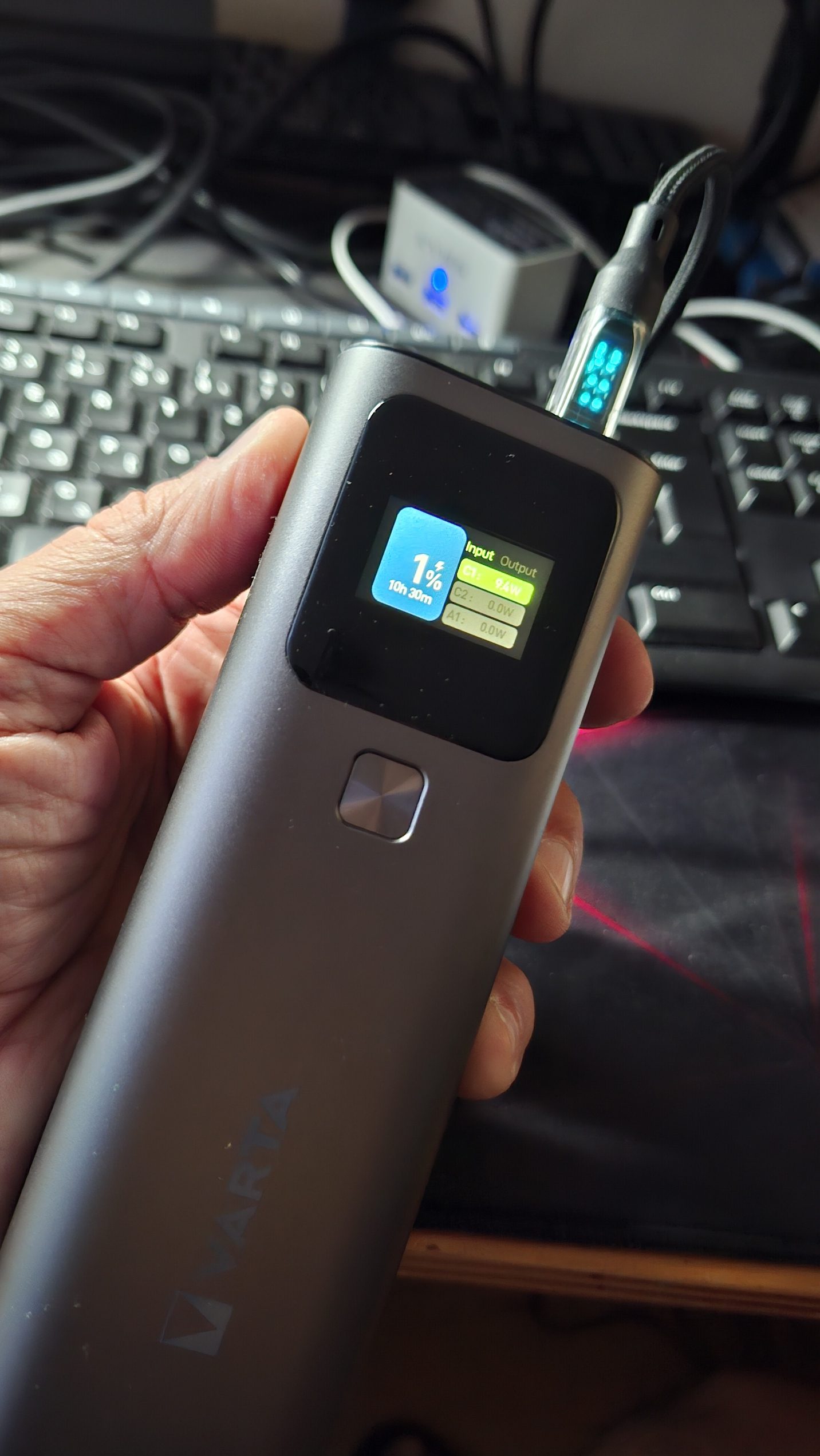 Papíron soknak tűnhet, de egy túrahátizsák oldalzsebében vagy felső rekeszében simán elfér, és még többnapos kirándulásnál sem zavaró. A powerbak a dobozban teljesen lemerült állapotban volt, így a töltéssel kellett kezdenem. Jó hogy a töltöttséget is mutatja a kijelző és azt is, hogy mennyi áramot vesz fel. Az én töltőkábelem is mutatja az átfolyó wattszámot, bár nem pont hajszálra egyformát mutatott. A powerbanknak nagyon jó a fogása. Örülök, hogy ilyen tömzsi, mert a nagy lapos powerbanokat kényelmetlen fogni.
